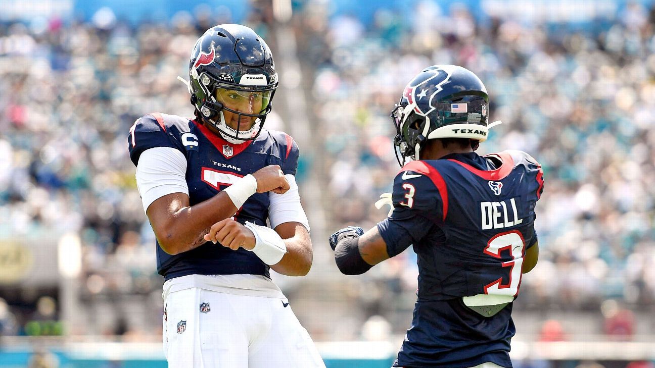 C.J. Stroud #7 of the Houston Texans and Tank Dell #3 of the Houston Texans celebrate during an NFL football game against the Jacksonville Jaguars, Sunday, September 24, 2023, at EverBank Stadium in Jacksonville, FL. (Melina Myers/USA TODAY Sports)